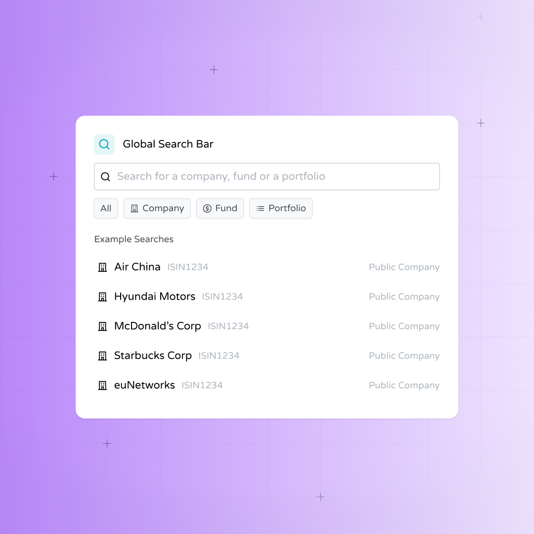 You can now quickly locate any company, fund, or portfolio across your dashboard using the new global search functionality. Simply start typing a name or keyword into the search bar at the top of your dashboard to: