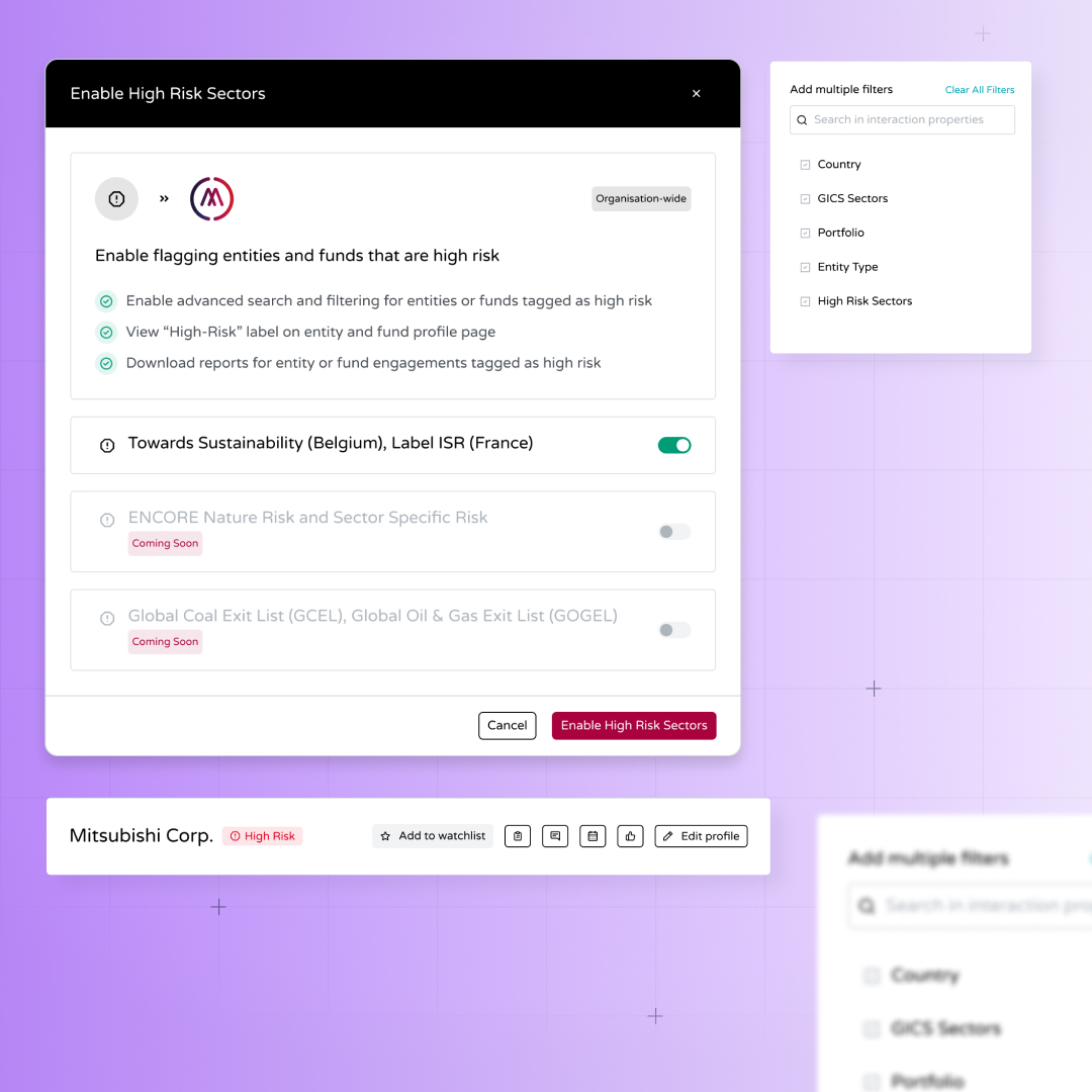 Easily identify and manage entities in high-risk sectors as defined by regulators like Febelfin (Belgium & France). Once enabled by your Super Admin, the system flags relevant entities, prompts users during engagements, and adds filtering, export, and analytics tools to streamline stewardship and compliance for “Towards Sustainable” products. Tags are system-generated based on sector classification and regulatory framework.
